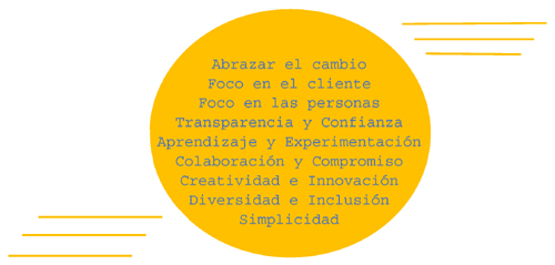 Cada organización elige y expresa sus valores en función de sus necesidades y prioridades estratégicas. Como ejemplo podemos ver los seis comportamientos Agile en The New Telefónica Way.