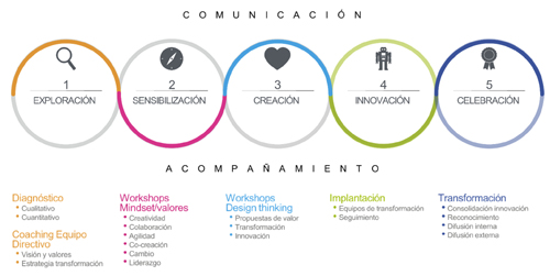Especialmente es necesario acompañar al equipo directivo a identificar necesidades y oportunidades de transformación digital y cultural, desplegar los valores deseados y modelos de liderazgo en indicadores de comportamiento, desarrollar un sentido de propósito, comunicar la Visión y las líneas estratégicas de la transformación.